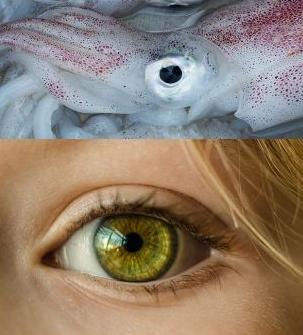 One famous example of independent convergent evolution that results in analogous structures are bird, insect, and bat wings. Another one is the development of camera-like eyes in cephalopods and vertebrates, such as squid and human eyes (Figure 5). Eyes have independently evolved at least 40 or possibly 65 times.