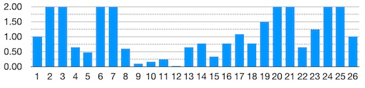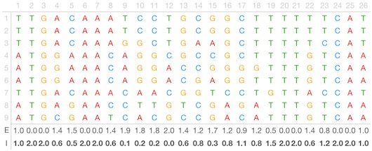 For the sake of an exercise, I also show the entropy and information calculations for the column 19. There are only two letters T and G with corresponding frequencies of \( \frac{8}{9} \) and \( \frac{1}{9} \); Thus, the entropy \(H\) is \(- \frac{8}{9} \times log_{2}(\frac{8}{9}) \) + \( \frac{1}{9} \times log_{2}(\frac{1}{9}) \) \( \approx 0.5\) bits, and the corresponding information \(I\) per letter is \( 2-0.5 = 1.5 \) bits.